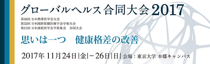 学術大会| 日程 | :2017年11月24日(土)~ 26日(日) | | 開催地 | :東京大学 本郷キャンパス内 | | 大会長 | :日本国際保健医療学会 神馬征峰(東京大学) 日本熱帯医学会 狩野繁之(国立国際医療研究センター研究所) 日本渡航医学会 濱田篤郎(日本医科大学病院) | | テーマ | :思いは一つ:健康格差の改善 |